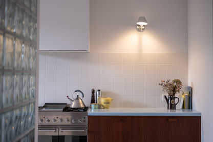 Le hall a été décloisonné pour devenir un élément central et catalyseur des différents espaces à vivre. La cloison de briques de verre laisse la lumière traverser l'appartement de part en part pour inonder l'espace aux différentes heures de la journée.